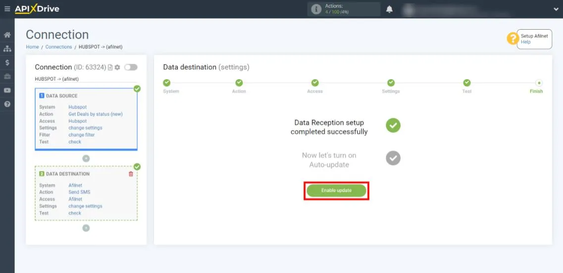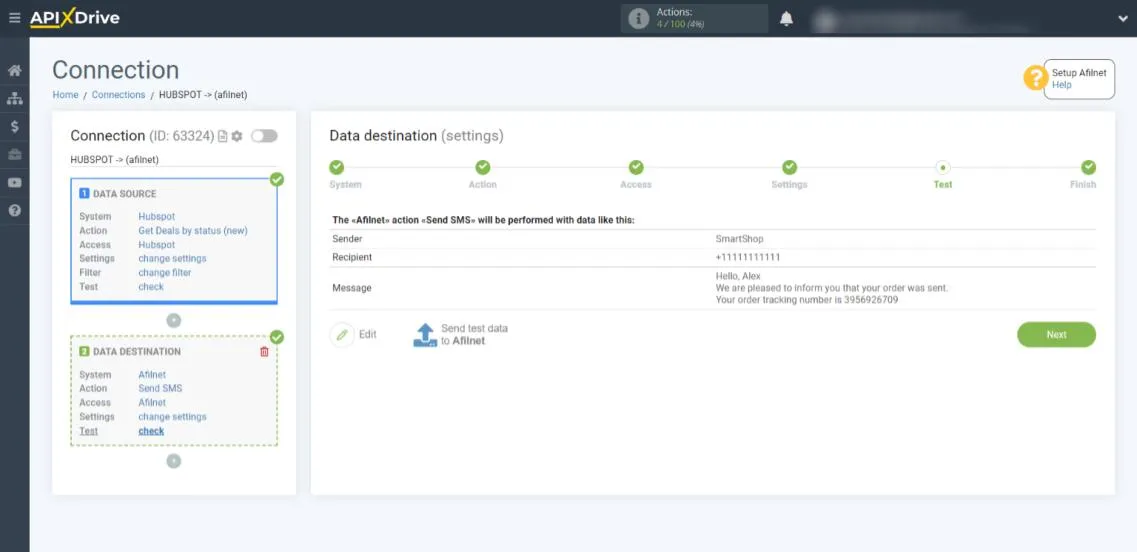 Eso es todo. ApiX-Drive iniciará notificaciones de entrega automáticas a través de Afilnet. Del mismo modo, puede configurar envíos de correos para otros servicios y eventos. Buena suerte con tu trabajo.