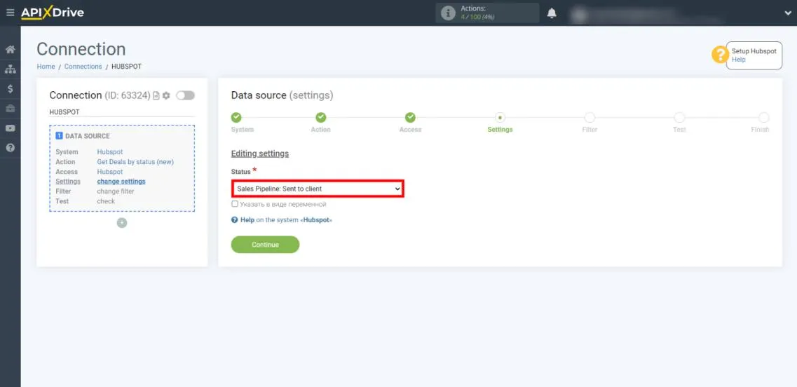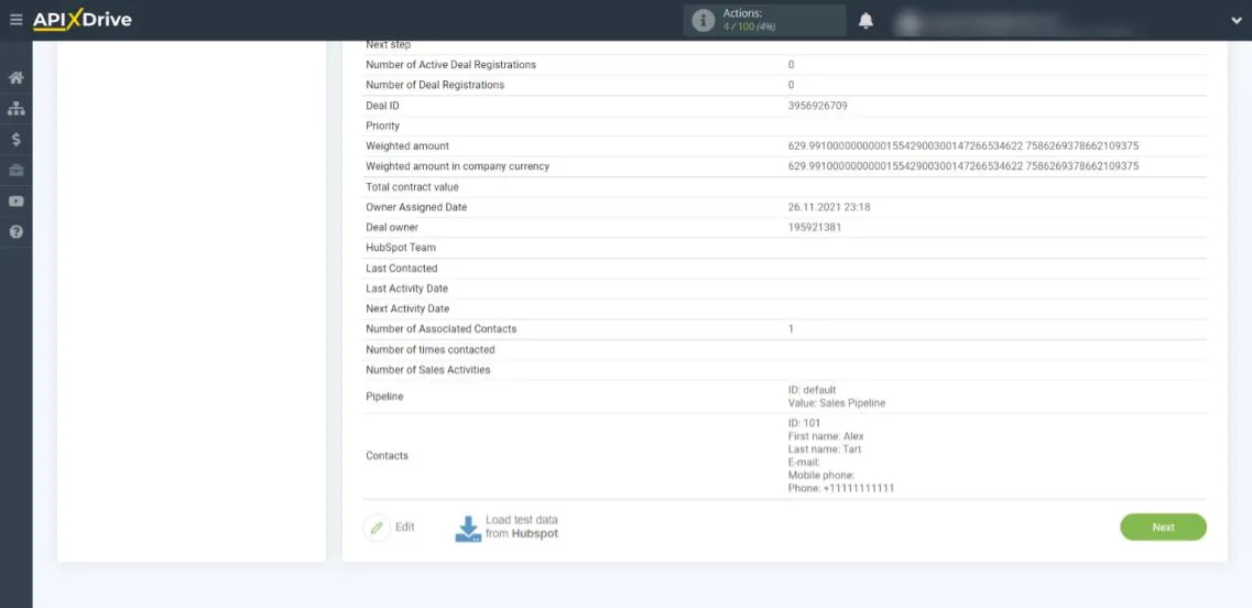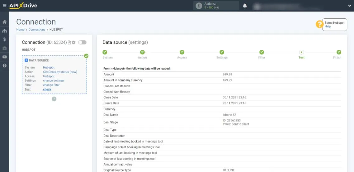 Para probar el funcionamiento del conector, agregue un producto de prueba a Hubspot, indique su número de teléfono en él y transfiéralo al estado "Enviado al cliente". Después de eso, volvemos a configurar ApiX-Drive y actualizamos la página. Si todo se hace correctamente, el conector descargará los datos de nuestra ficha de producto.