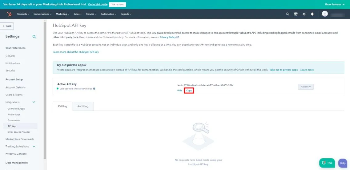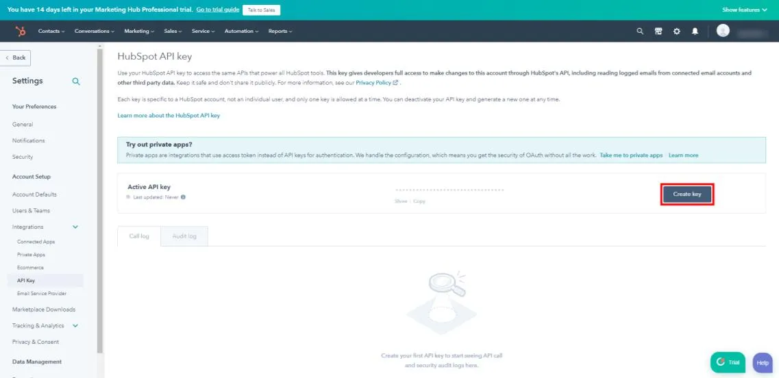 Abre tu cuenta de Hubspot en una nueva pestaña del navegador. Vamos a la configuración de la cuenta y a la izquierda hacemos clic en "Integración" - "Clave API". Después hacemos clic en "Crear clave".